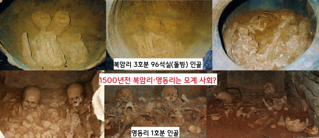 형질 및 유전자 분석결과 복암리와 영동리 출토 인골들의 특성은 모계가 같은 인물들이 한 무덤에 묻혔다는 것이다. 1500년전 복암리와 영동리가 모계사회였다는 방증자료가 된다.|동신대 영산강문화연구센터 제공·김재현 동아대 교수 설명