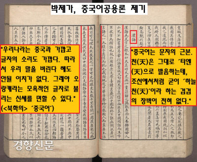 조선의 현실을 답답하게 여긴 박제가는 아예 중국어공용론까지 펼친다. 박제가는 ‘하늘 천(天)’자를 예로 든다. 중국에서는 하늘을 그냥 ‘티엔(天)’이라 하는데, 왜 조선에서는 굳이 ‘하늘 천’이라 하고, 대화를 나눌 때는 ‘하늘’이라 하느냐는 것이다. 그냥 ‘천’이라고 하면 된다는 것이다 .