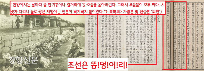 엄청난 ‘디스’죠. 이건 약과입니다. “한양에서는 날마다 뜰 한귀퉁이나 길거리에 똥·오줌을 쏟아버린다. 그래서 우물물이 모두 짜다. 시냇가 다리나 돌로 쌓은 제방에는 인분이 덕지덕지 붙어있다.”