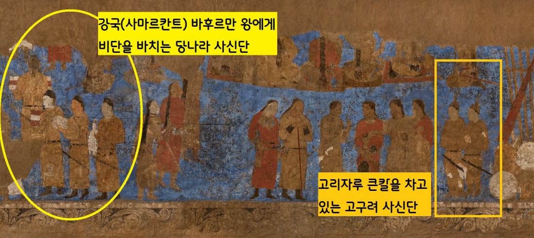 그때면 당나라의 세계관이 사마르칸트까지 영향을 미쳤다는 것이다. 결국 고구려 사절은 사마르칸트의 입장에서 동쪽의 끝에 자리한 대표 국가를 그린 관념적이고 상징적인 표현이라는 것이다.
