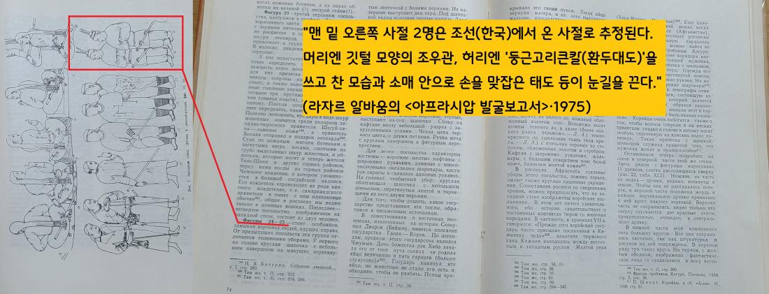 발굴자인 라자르 알바움은 1975년 펴낸 보고서에서 “서벽의 맨 오른쪽 사절은 한국인 사절로 추정된다”면서 “머리에 깃털 모양의 조우관을 쓴 두 사신의 패션과 허리에 찬 ‘둥근고리큰칼(환두대도)’, 소매 안으로 손을 맞잡은 태도 등이 심상치않다”고 전했다.|국립중앙박물관 소장