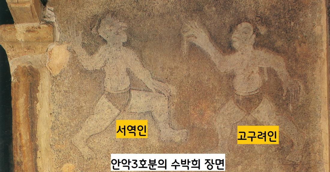 안악3호분의 남쪽 동벽에는 수박희(맨손 격투기)를 겨루는 두 사람이 보인다. 한 명은 고구려인 같다. 그러나 상대방은 코가 유난히 높고 눈도 크다. 서역계 인물로 보인다.