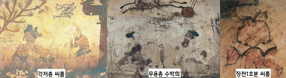 각저총, 무용총, 장천1호분의 씨름 및 수박희 장면 가운데는 고구려-서역인의 대결구도로 짜인 그림이 많다.