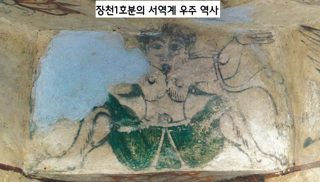 장천1호분의 천장 고임 각 모서리에 그려진 우주역사는 전형적인 서역인의 모습이다. 두 다리를 좌우로 벌리고 엉덩이가 땅에 닿을 정도로 무릎을 굽혀 버틴 자세로 두 팔을 힘껏 위를 받치고 있다.