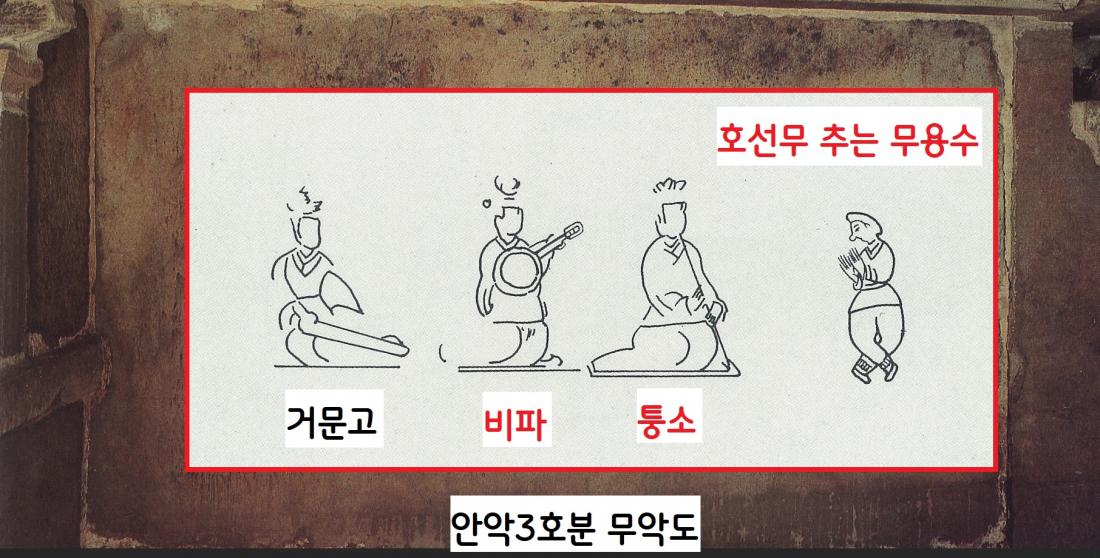 안악3호분(357년)에는 비파와 퉁소 등을 서역 악기를 연주하는 악사와 함께 춤을 추는 무용수가 눈에 띈다.