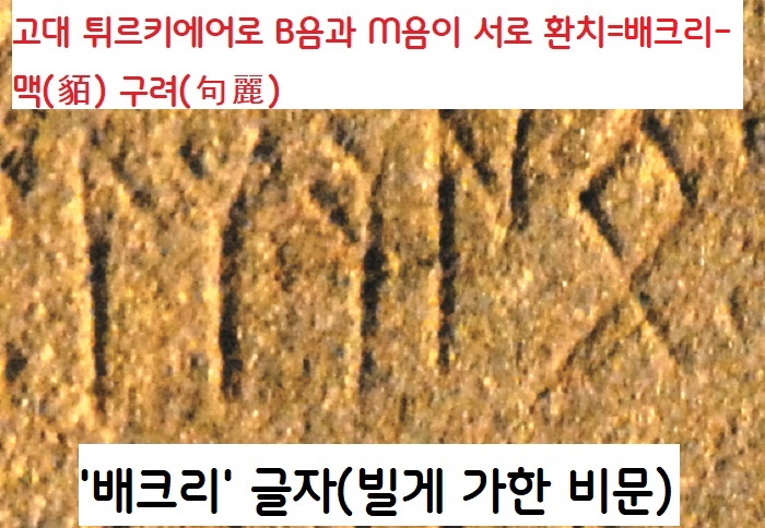 그런데 두 비문에는 돌궐의 시조인 부민 가한(재위 552~553)과 그 동생인 이스태미(?~576) 가한의 장례식에 참석한 각 나라의 조문 사절이 기록되어 있다. “해가 뜨는 쪽의 배크리가 조문했다”는 내용이 보인다. 또 “돌궐이 당나라에 50년간 복속되었는데, 그때 해뜨는 쪽의 배크리 가한까지 정복했다”는 대목도 들어있다. 고대 튀르키에 어에서 B음과 M음이 서로 환치될 수 있다. 따라서 ‘배크리’는 ‘매크리’가 된다. 즉 ‘맥(貊)+구려(句麗)’를 음차한 말로 추정된다.