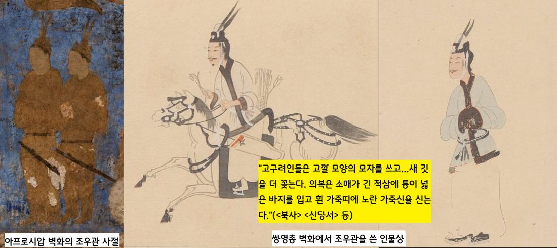 또 “고구려인들은 고깔 모양의 모자를 쓰고…새 깃을 더 꽂는다”는 <북사>와 <신당서> 등의 기록도 거론한다.