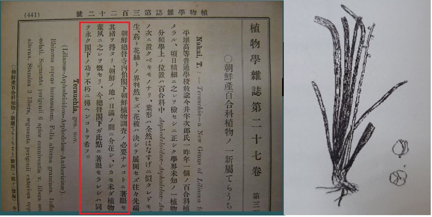 각설하고 나카이는 왜 평양 인근에서 채집된 이 식물에 하필이면 데라우치의 이름을 붙였을까요. 나카이가 1913년 발간된 <식물학 잡지>’에 그 사연을 자랑스럽게 밝힙니다.