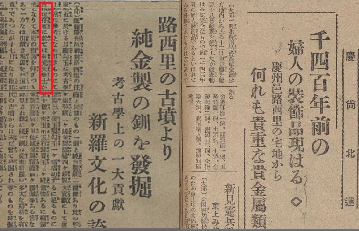 즉각 신고가 이뤄졌고, 총독부 박물관은 발굴전문가로 아리미쓰 교이치(有光敎一·1907~2011)를 급파합니다. 발굴결과 순금제 목걸이 33점과 곡옥·관옥·환옥 달린 목걸이, 순금제 귀고리 등 수십 여 점의 유물을 수습했습니다. <조선시보>는 4월9일부터 20일과 21일까지 ‘고고학상 중대자료 희대의 귀고리 장식 발견’ 등의 제목으로 대서특필했습니다. 아리미쓰는 유물이 발굴한 곳을 노서리 140호분에 딸린 무덤으로 여겼습니다. 그러나 발굴은 그것으로 끝났습니다.