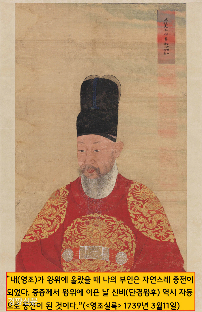 “날 봐라. 내가 임금이 되었을 때 내 부인은 이미 중전이 됐다. 중종이 왕위에 이은 날 신비(단경왕후) 역시 자동으로 중전이 된 것이다.”(<영조실록> 1739년 3월11일)