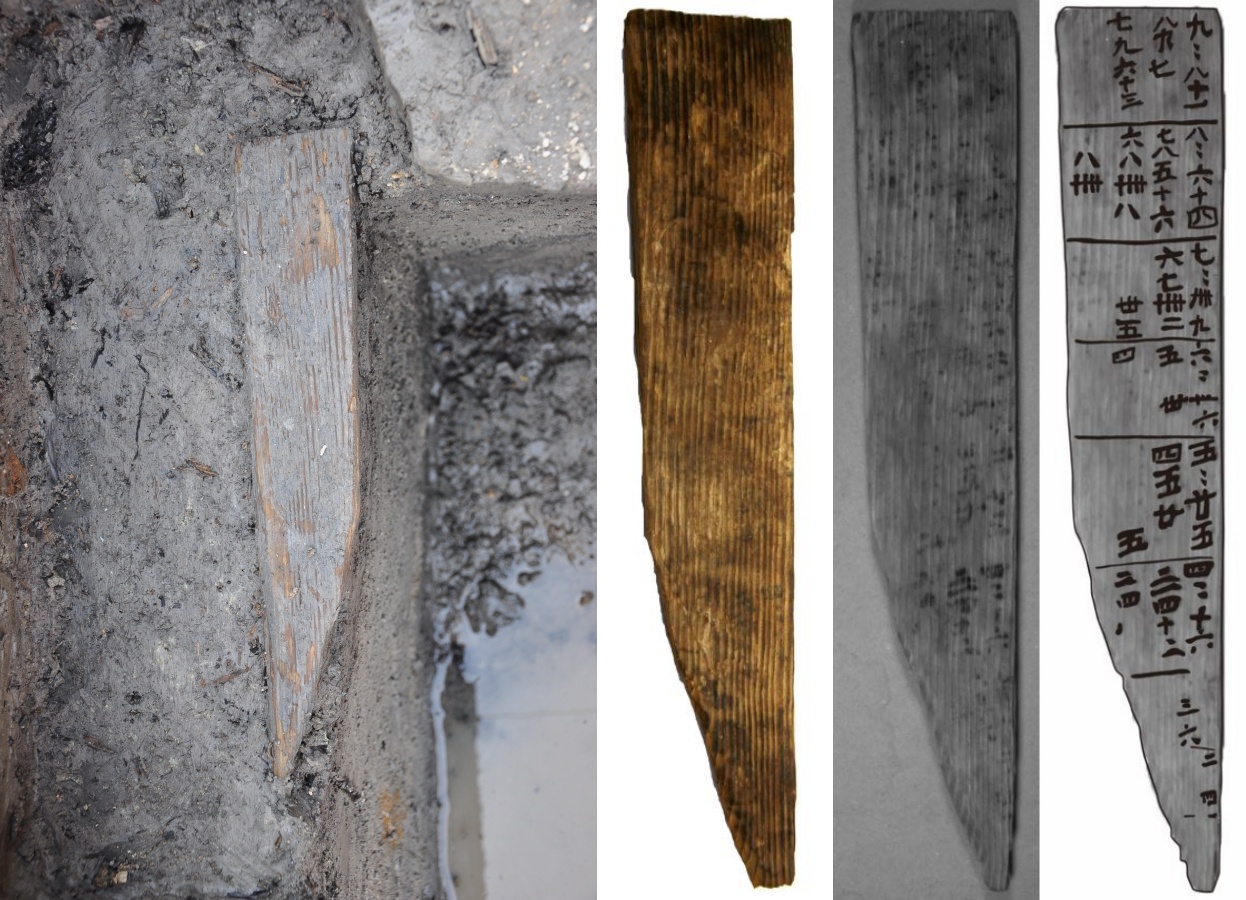 숫자가 잔뜩 기록된 명문목간(6~7세기 백제)이었습니다. 발굴단인 한국문화재보호재단은 적외선 촬영으로 목간의 정체를 분석했지만 확실하게 파악하지는 못했습니다. 그저 관청에서 문서나 물건 등을 운송하면서 사용한 것으로 짐작했을 뿐이죠.