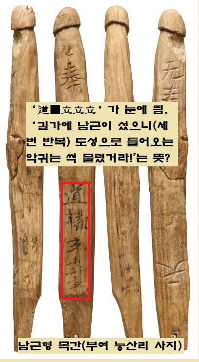 특히 한쪽 면에 새겨진 ‘도○립립립(道○立立立)’이라는 글자가 눈에 띕니다. 이 목간은 사비성으로 들어오는 중심도로와 아주 가까운 곳에서 확인됐습니다. 백주대로에서 이상야릇한 목간이 발견된 건데요. 연구자들은 이를 두고 색다른 해석을 내리고 있어요. 예부터 남근은 나라의 안녕, 그리고 악신·질병의 추·예방 등을 위해 숭배되고 신성시됐는데요.