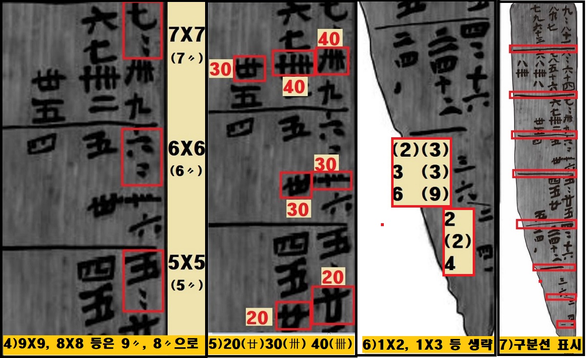 예컨대 9×9는 ‘9〃’, 8×8은 ‘8〃’ 등으로 줄였습니다. 또 20(卄), 30(삽), 40의 표기법도 흥미로웠습니다. 결과가 뻔한 1×2, 1×3, 1×4…는 생략했습니다. 구구단의 패턴도 특이했습니다.
