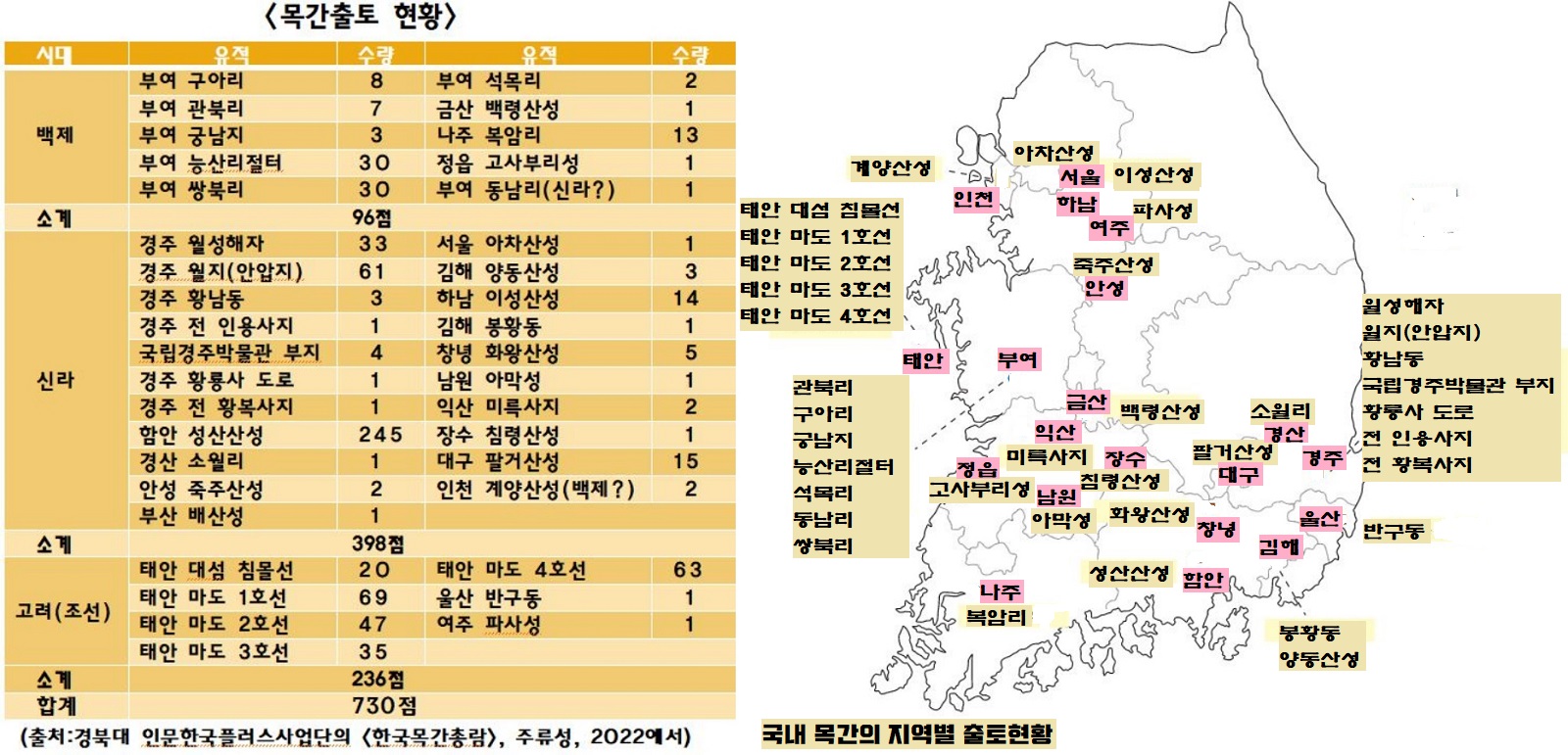 최근 경북대 인문학술원 인문한국플러스 사업단이 펴낸 <한국목간총람>에 따르면 해방 이후 확인된 목간(삼국~조선)은 730여점에 이릅니다. 목간은 주로 습기가 많은 우물이나 연못, 저수지, 배수지 같은 곳에서 집중 출토됩니다. 목재는 산소가 차단된 물 속에서 좀처럼 부식하지 않기 때문에 수백 수천년 동안 보존되는 거죠.