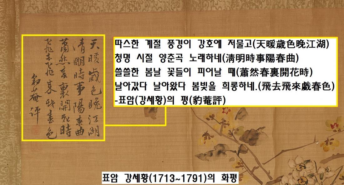먼저 표암은 “…쓸쓸한 봄날 꽃들이 피어날 때(蕭然春裏開花時) 날아갔다 날아왔다 봄빛을 희롱하네(飛去飛來戱春色)”라 쓴 뒤 “표암(강세황)이 평하다(豹菴評)”는 멘트를 남겼다.