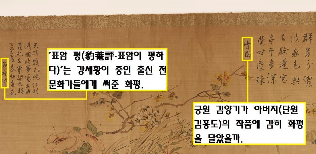 그렇다면 이 ‘꽃 두루마리’ 그림은 단원 김홍도의 작품일까. 마침 김홍도의 아들인 ‘김양기’의 글이 화폭에 있다는 것도 수상쩍지 않은가. 그러나 그럴 가능성이 거의 없단다.(정은진 교수)