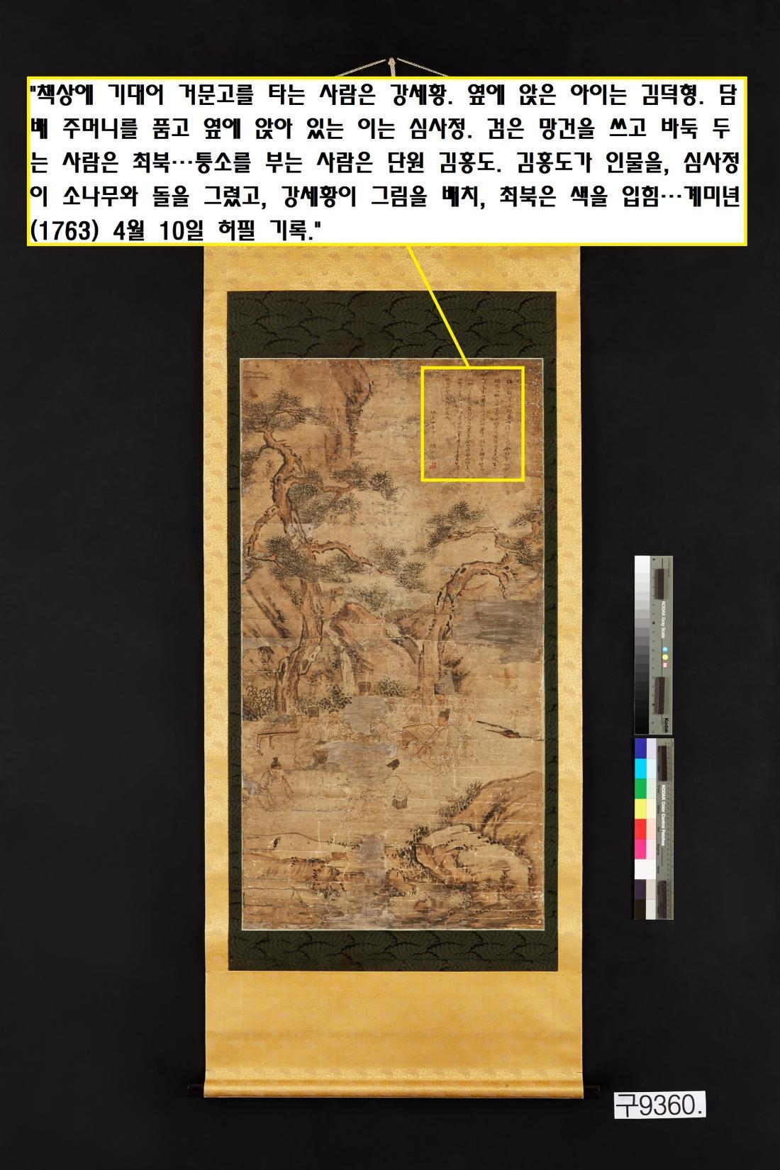 “책상에 기대어 거문고를 타는 사람은 표암 강세황…옆에 앉은 아이는 김덕형…옆에 앉아 있는 이는 현재 심사정…검은 망건을 쓰고 바둑 두는 사람은 호생관 최북…호생관과 마주하여 바둑을 두는 사람은 추계(미상)이다. 구석에 앉아 바둑을 관전하는 이는 허필…자리에 기대어 비스듬히 앉은 사람은 균와(미상)…균와와 마주하여 퉁소를 부는 이는 단원 김홍도….”