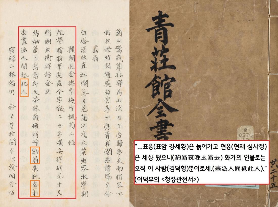 ‘현옹’은 ‘현재 심사정’이고, ‘표옹’은 ‘표암 강세황’을 가리키는 말이다. 이덕무는 김덕형을 심사정-강세황의 뒤를 잇는 화단의 큰 인물로 꼽았던 것이다.