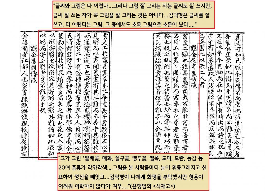 “글씨와 그림은 다 어렵다…그러나 그림 잘 그리는 자는 글씨도 잘 쓰지만, 글씨 잘 쓰는 자가 꼭 그림을 잘 그리는 것은 아니다…김덕형은 글씨를 잘 쓰고, 더 어렵다는 그림, 그중에서도 초목의 그림으로 소문이 났다….”