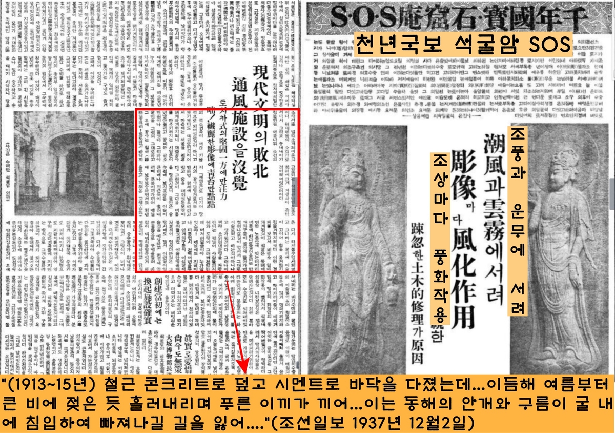 조선일보 1937년 12월2일자. “일제강점기(1913~15)에 석굴암에 콘크리트 돔을 씌웠지만 동해로부터 흘러들어오는 운무과 습기 때문에 석굴암이 물바다가 되었다”고 전했다.