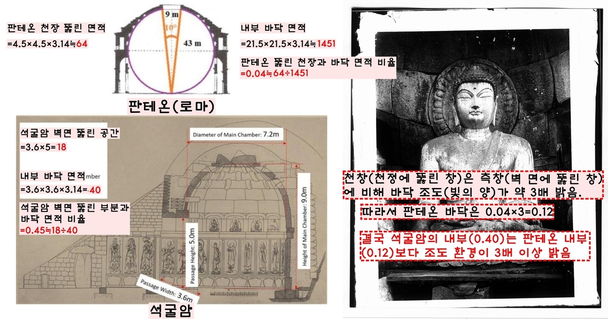 석굴암의 바닥조도가 로마의 판테온보다 3배 이상 밝다는 연구결과가 있다. 예전과 같은 석굴암이라면 조명없이도 밝게 보인다는 뜻이다.|윤재신 전 이화여대 교수 설명