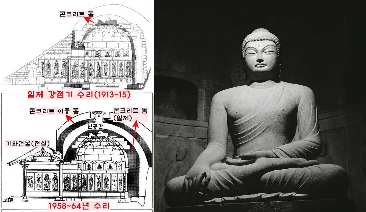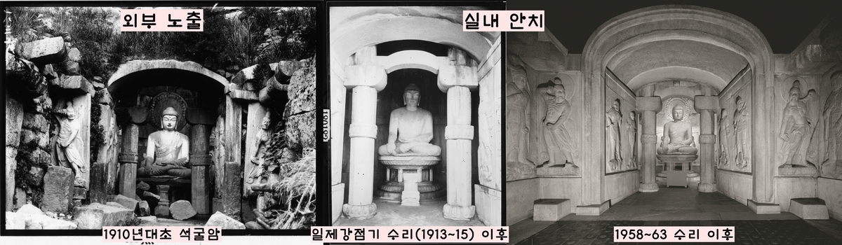 석굴암은 야외에 노출된 석불이었지만 일제강점기(1913~15) 와 1958~64년 수리를 거치면서 콘크리트 이중돔과 기와건물 속에 안치되었다