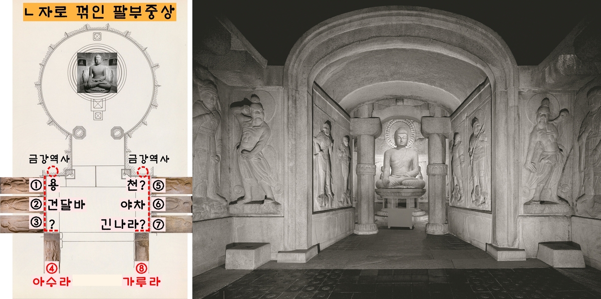 석굴암 양옆에 서있는 팔부중상 중 오른쪽 5~8번 상. 애초에 팔부중상은 왼쪽의 1~4상 중 4번째(아수라상)과 오른쪽의 5~8상 중 8번째(가루라상)이 안쪽으로 굴절되어 있었다. 그러나 1958~64년 대대적인 수리·복원 때 일렬로 펴놓았다. 기와건물 조성을 위해 공간을 넓히려 한 것이다.