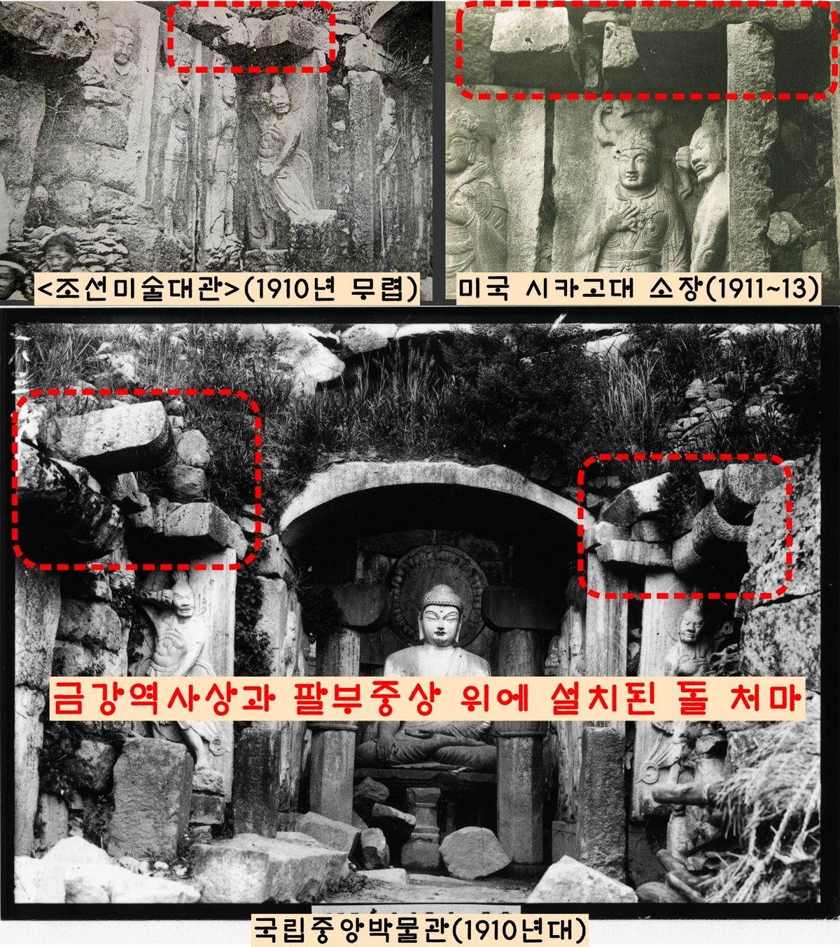 1910년대초 수리 복원 이전의 석굴암 모습. 석굴암 앞면에 보이는 금강역사상과 옆면에 조성된 팔부중상의 윗부분에서 처마의 역할을 하는 석재가 보인다. 야외에 노출된 석굴암의 원형을 짐작할 수 있다.|강현 국립문화유산연구원 설명