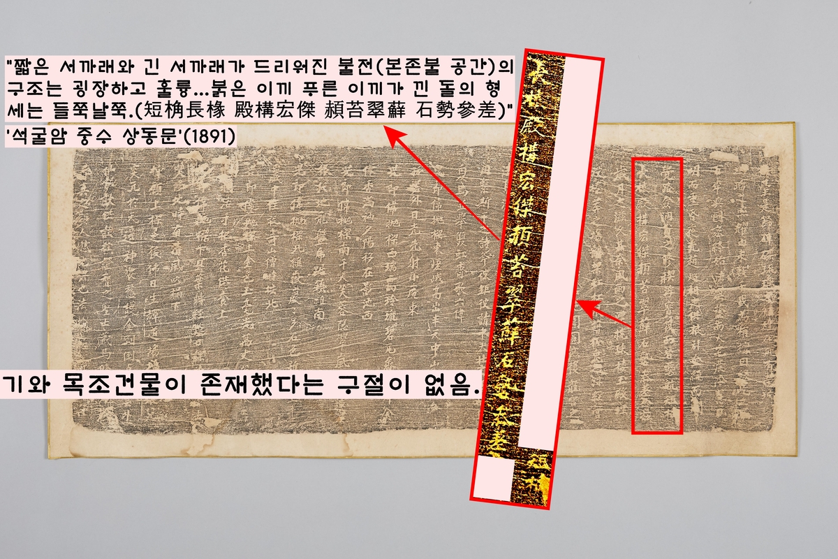 그리고 1960년대 석굴암 수리공사단이 ‘기와건물의 존재’ 방증자료로 거론한 1891년 ‘석굴암 중수 상동문’도 마찬가지다. ‘과거에 석굴암에 기와건물이 존재했었다’는 구절이 보이지 않는다.