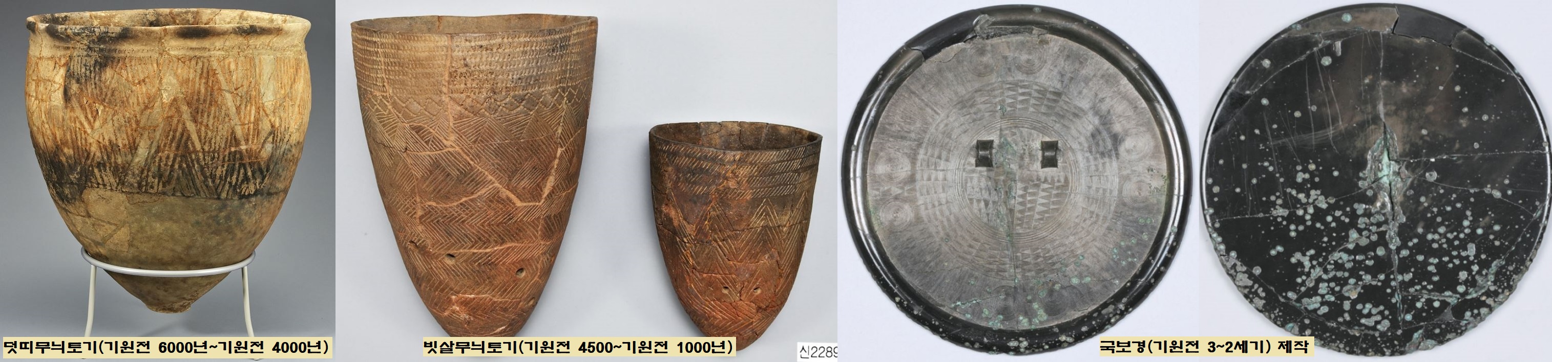 최근 ‘국보경’ 문양의 원형을 신석기 시대 대표유물인 덧띠·빗살무늬 토기에서 찾는 연구가 시도되고 있습니다.(김찬곤의 <빗살무늬 토기의 비밀>, 뒤란, 2021) 국보경의 무늬가 기존의 견해대로 태양이나 햇빛이 아니고, 덧띠·빗살무늬 토기의 문양 역시 기하학 무늬가 아니라는 겁니다. 국보경이나 덧띠·빗살무늬 토기 문양은 하늘과, 비, 구름을 그린 문늬라는 겁니다.