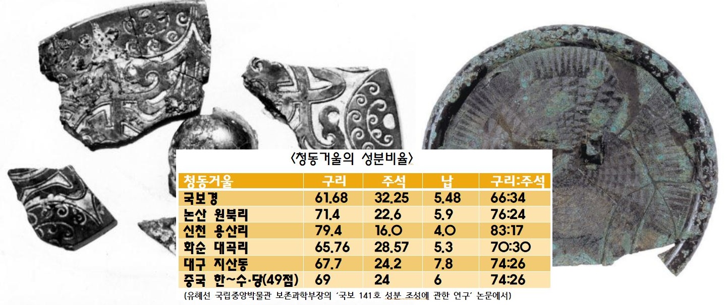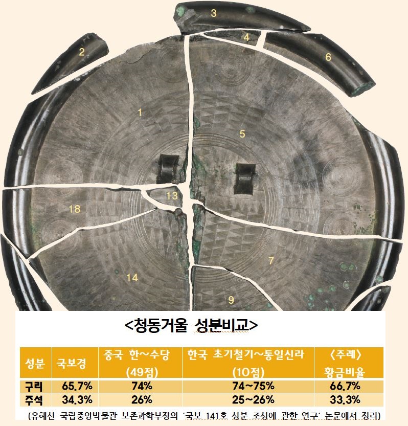 2007년부터 1년간 국립중앙박물관의 분석결과 숭실대 소장 ‘국보경’의 실체에 한걸음 다가가게 되었는데요. 즉 ‘국보경’은 구리와 주석비율로 따지면 ‘65.7(구리)대 34.3(주석)’이었는데요.