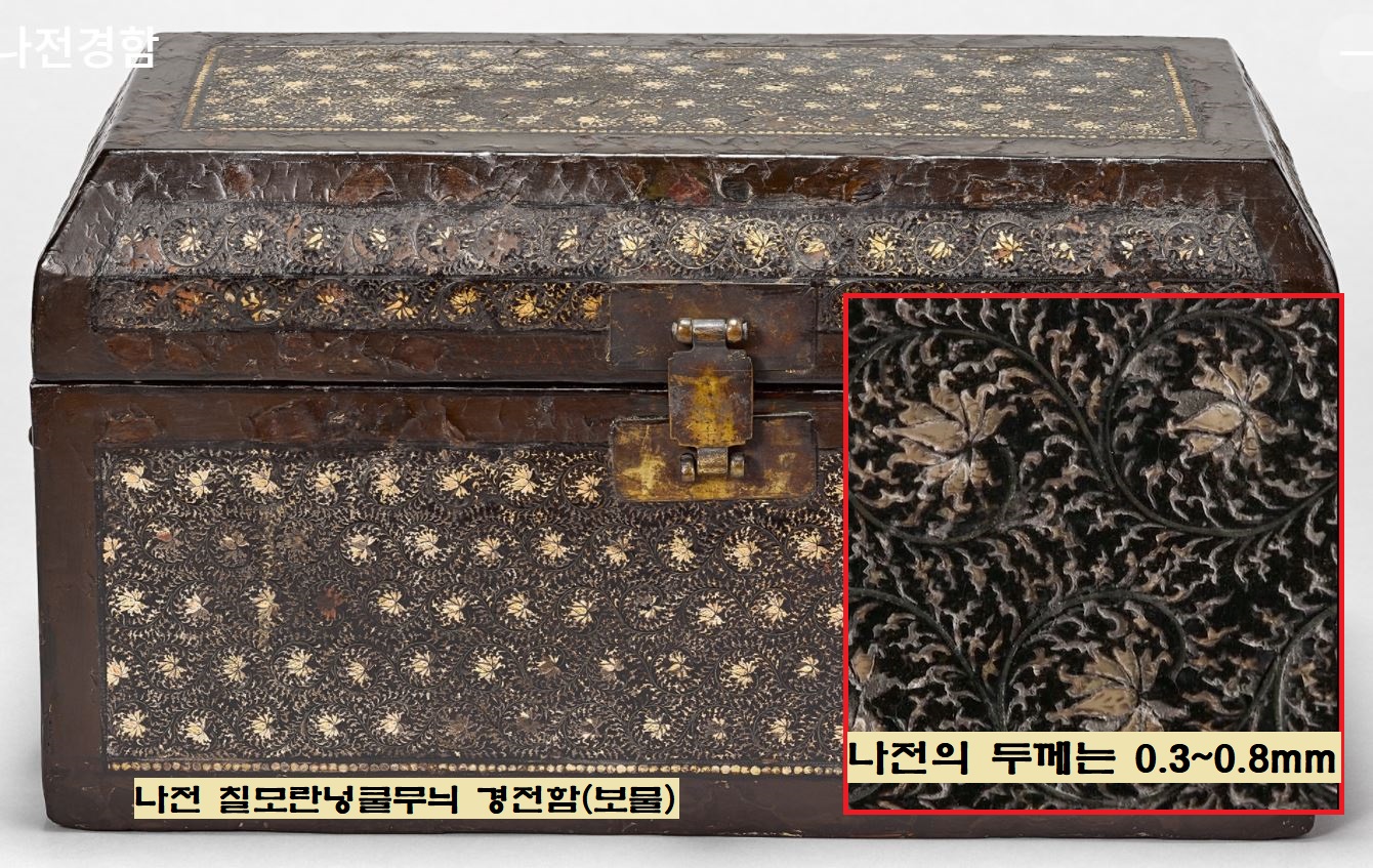 예컨대 ‘나전 칠 모란넝쿨무늬 경전함’(보물)의 경우 함에 사용된 나전의 두께는 0.3~0.8mm 정도에 불과합니다. 여기서 꽃잎과 이파리의 한조각 크기는 1㎝를 넘지 않습니다. 작은 것은 2~3㎜ 정도입니다.
