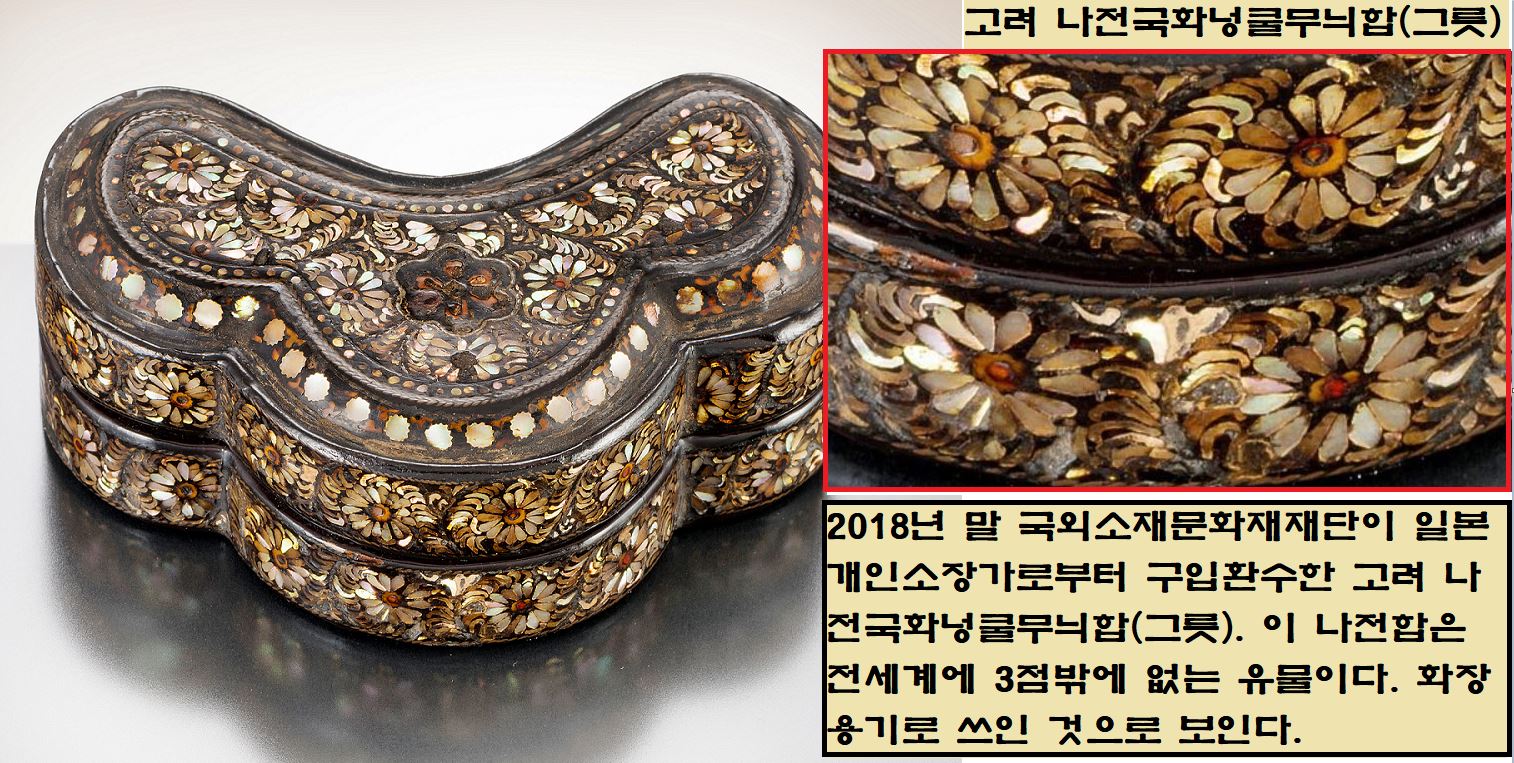 국내에는 불자 1점 뿐이었습니다. 그러다 2014년 일본인 소장가에게서 나전경전함을 구입했구요. 2019년 12월 국외소재문화재재단이 전 세계에 단 3점 뿐인 나전국화넝쿨무늬합(그릇)을 일본소장가로부터 구입 환수했습니다. 이로써 국내의 고려나전 유물은 3점으로 늘어났습니다.