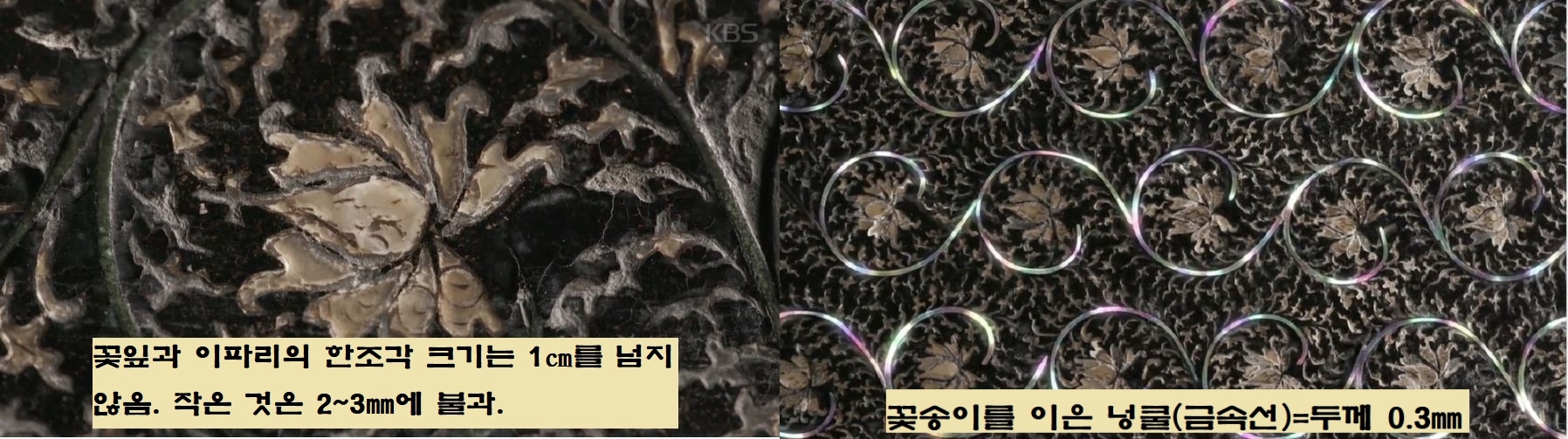 꽃송이를 이은 넝쿨은 금속선으로 만드는데 이것도 그 두께가 0.3㎜에 불과합니다. 나전으로 만든 경전함의 경우 2만5000개의 나전 조각이 사용되었습니다.