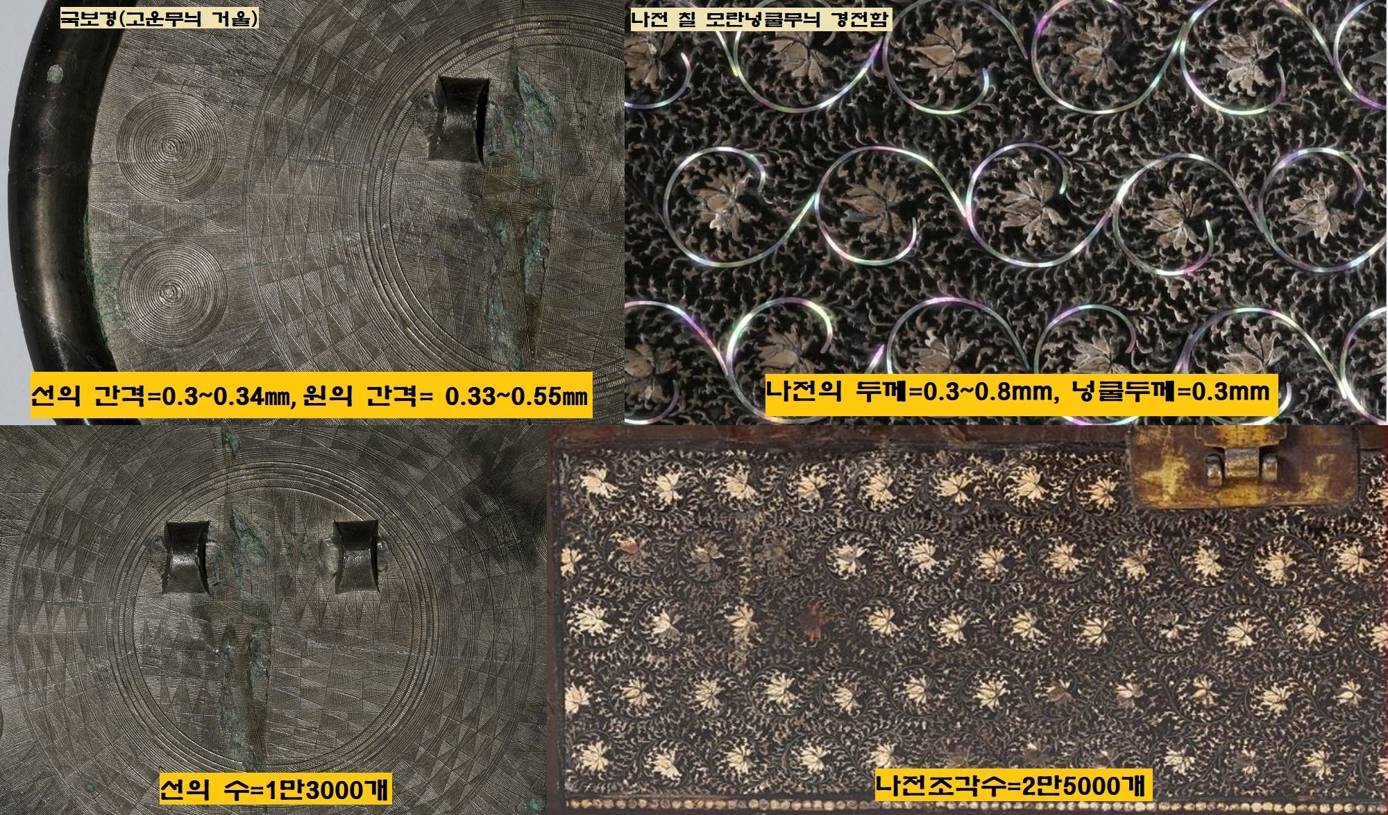 ‘0.3㎜’ 두께라면 어떻습니까. 바로 ‘고려 나전 경전함’(보물)에 사용된 나전의 두께가 0.3~0.8mm 정도이고, 금속선으로 꽃송이를 이은 넝쿨의 두께가 0.3㎜에 불과하다고 했죠. 0.3㎜의 극초정밀 예술이 1500년의 시공을 초월한 장인들의 인내심과 집중력을 보여주고 있죠. ‘국보경의 선=1만3000개, 고려경전함의 나전조각=2만5000개’라는 사실 역시 놀랍기는 마찬가지구요.