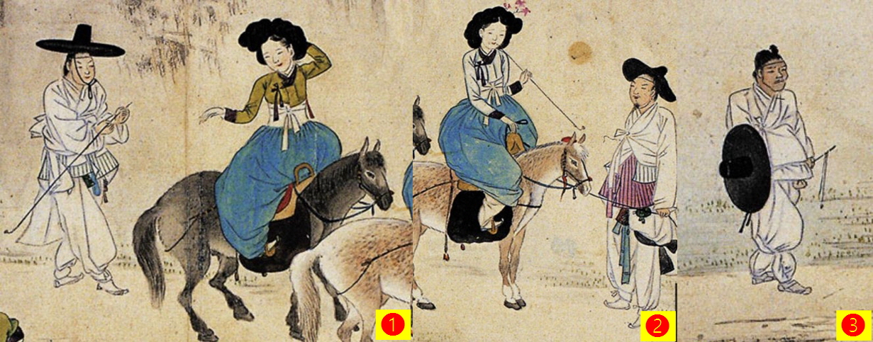 저를 가장 웃게 만든 작품은 ‘연소답청(年少踏靑)’입니다. ‘연소답청’은 기생들의 봄나들이를 그린 작품인데요. 그런데 저 양반들의 꼬락서니를 보십시요. 기생들을 말에 태운 것도 모자라 말에 탄 기생이 손을 내밀자 얼른 달려와 담뱃대를 건네주고 있네요. 게다가 다른 남자는 자기 갓을 마부에게 넘기고, 정작 자기는 마부의 벙거지를 쓰고 걷고 있습니다. ‘당신의 마부가 되겠다’는 거죠. 마부의 표정을 보십시요. 차마 상전의 갓을 쓰지는 못하고서 고삐 대신 갓 잡고 채찍을 든채 맨상투에 심통이 가뜩 나서 뒤만 따라갑니다.