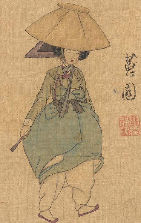 이 가운데 ‘전모를 쓴 여인’은 노란 전모(조선시대 여성들이 쓰던 나들이용 쓰개)를 쓰고 부채를 든 여인이 외출하는 모습을 그린 작품입니다. 배경도 없습니다.