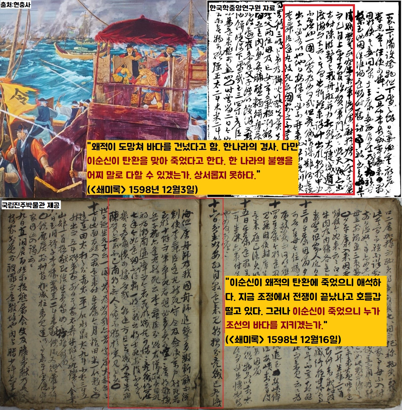 <쇄미록>은 “전라 좌수사 이순신이…적선 42척을 불태웠다”는 옥포해전(1592년 5월)과 ‘경상 우수사 원균과 전라 우수사 이억기 등과 함께 대승을 거둔 한산대첩(7월8일)의 전과를 소개한 뒤 “10일에도 적선 80여척 등을 나포했다”는 등의 기록했습니다. 오희문은 1598년(선조 31) 12월 3일자에서 왜군의 철병 소식을 전하면서 “(노량해전에서) 이순신이 탄환을 맞아 죽었다고 한다”면서 “나라의 불행을 어찌 말로 다할 수 있겠느냐”고 슬퍼했습니다.