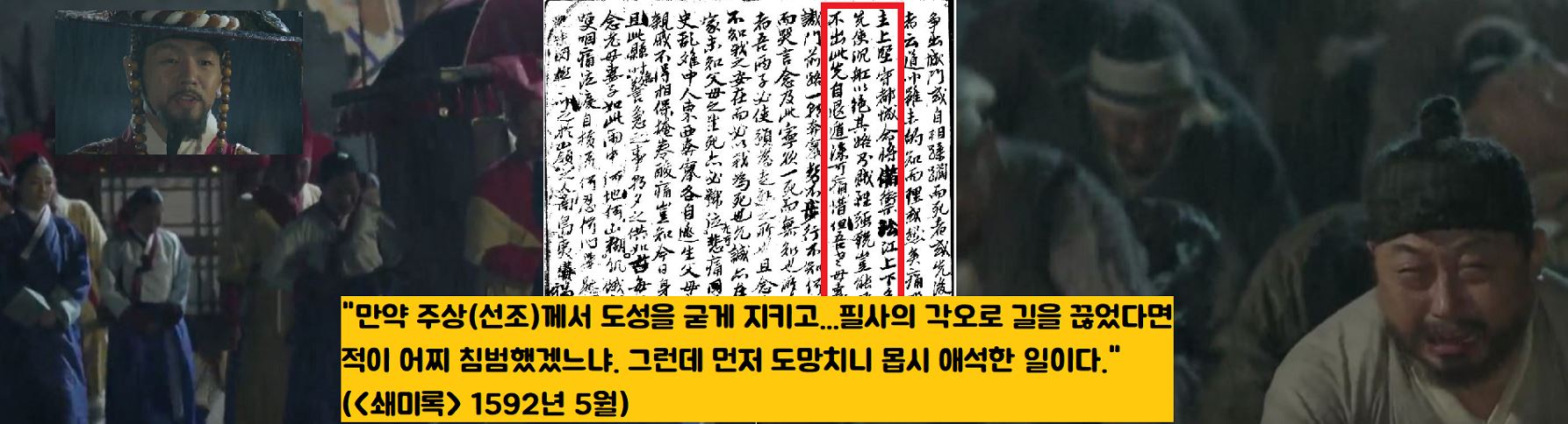 “만일 주상께서 도성을 굳게 지키고 장수에게 명하여 미리 준비하여 막고…필사의 각오로 길을 끊었다면 적이 어찌 침범하겠느냐. 그런데 먼저 도망가니 몹시 애석한 일이다.”(1592년 4월)