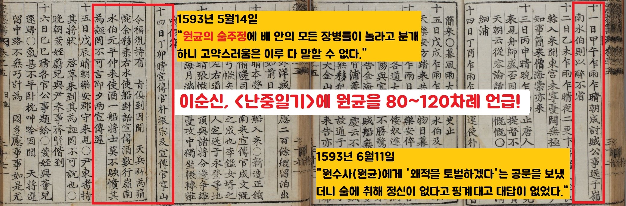 “원균의 술주정에 배 안의 모든 장병들이 놀라고 분개하니 고약스러움은 이루 다 말할 수 없다.”(1593년 5월 14일) “원균이 잔뜩 취해서 흉악하고 도리에 어긋나는 말을 함부로 했다. 해괴했다.”(1593년 8월 26일) “원균이 온갖 계략으로 나를 모함하려 덤비니 이 역시 운수다. 뇌물로 실어보내는 짐이 서울 길에 잇닿아있다.”(1597년 5월 8일)