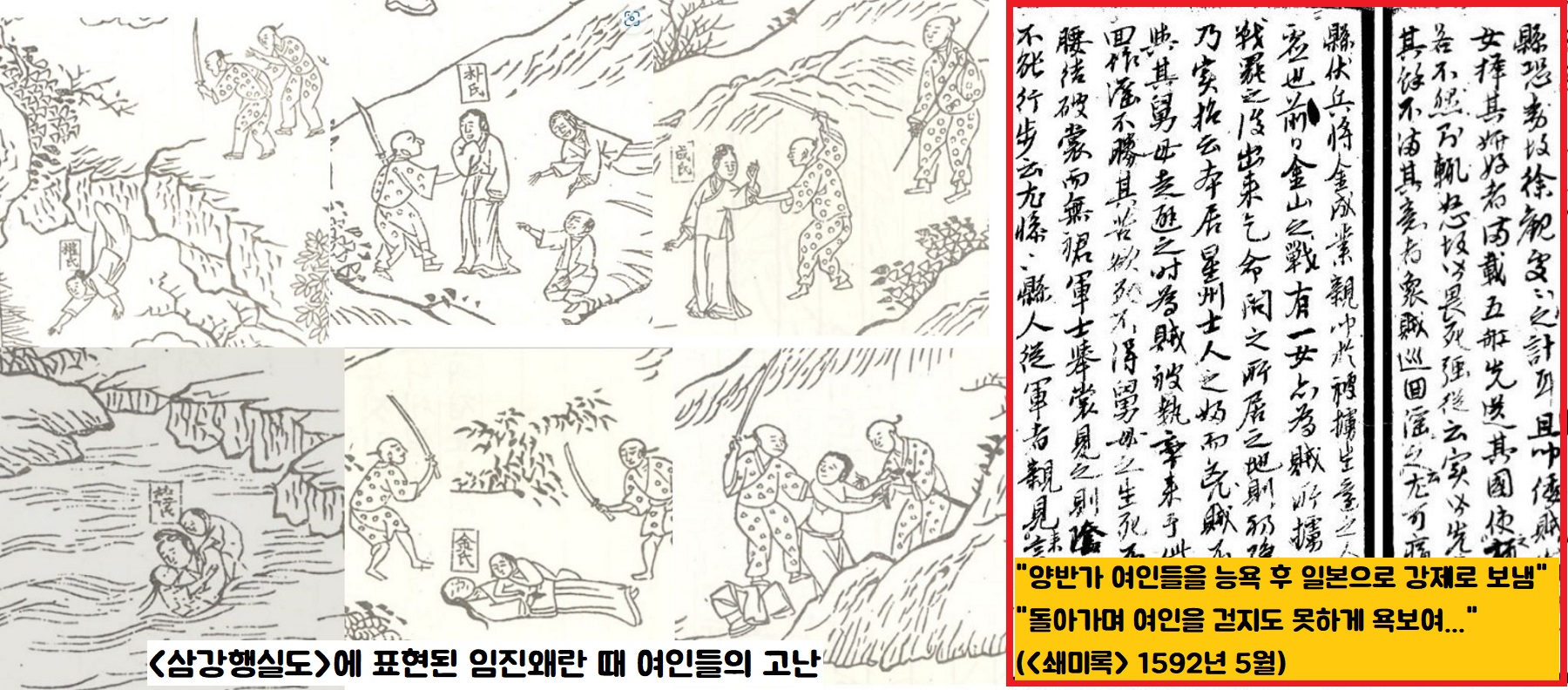 “왜적의 포로가 된 여인이 적들에게 돌아가며 강간 당해 자결하려다가...치마를 들춰보니….”(1592년 5월)