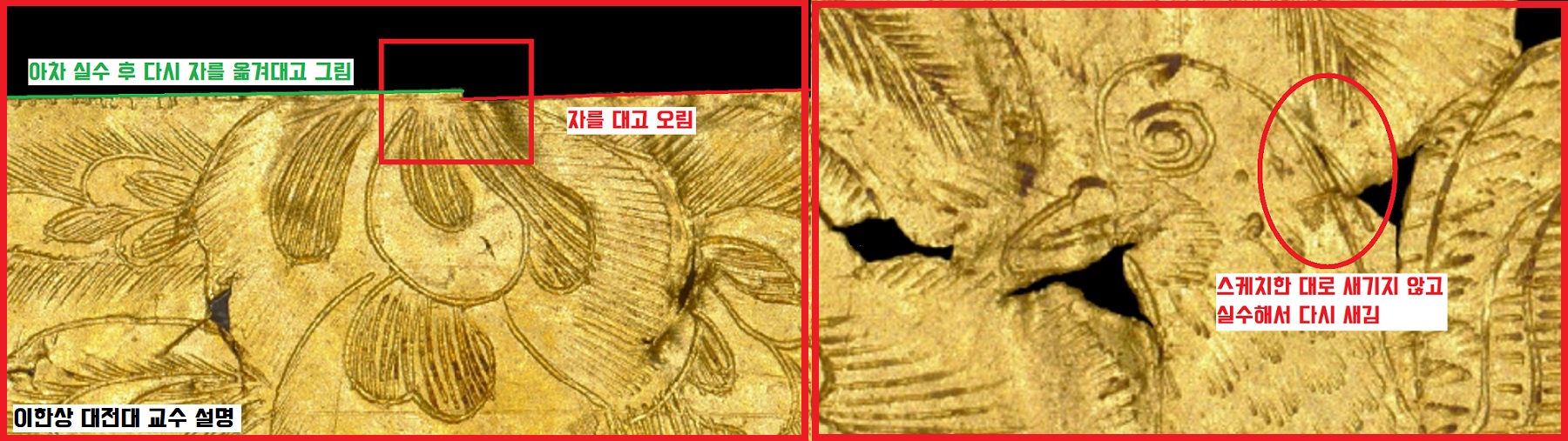 그런 작은 금판에 문양을 새기다보니 아차 실수한 흔적도 보인다는데요.