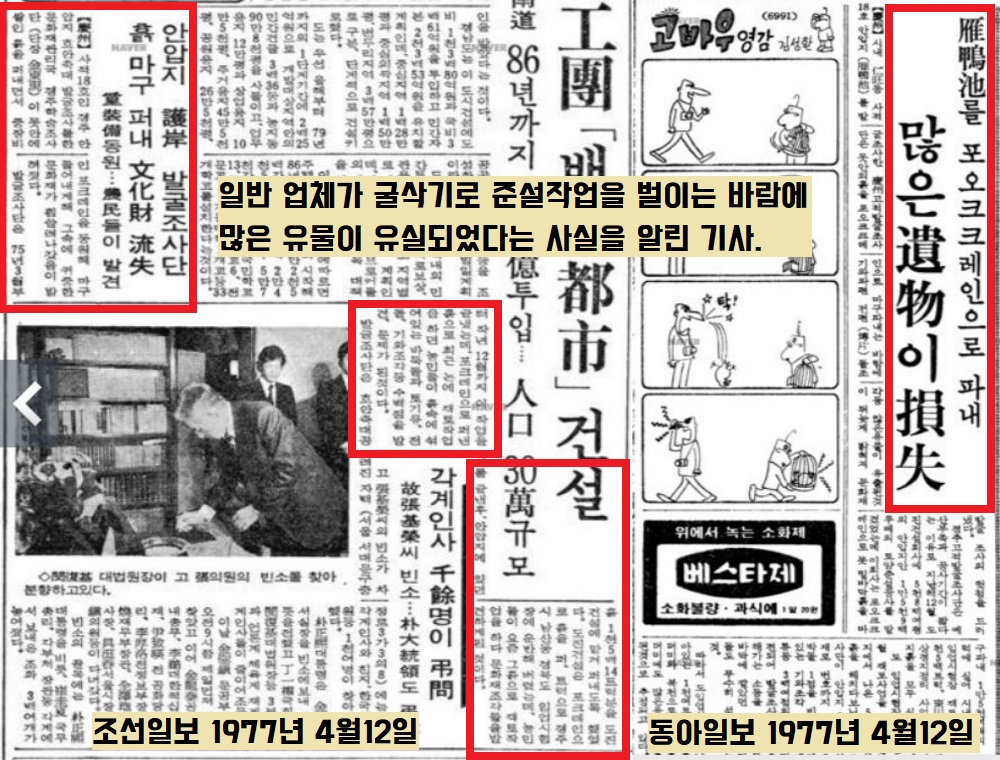 이때의 에피소드가 기막힙니다. 인부들에게 “유물이 출토되면 신고해달라”고 했더니 “그걸 공짜로 신고하느냐. 막걸리 값을 쳐주지 않으면 줄 수 없다”면서 고경희 조사원이 보는 앞에서 신라토기(접시)를 깨버리는 이들도 있었답니다. 인부들 중 일부가 삽과 곡괭이로 퍼낸 흙을 손수레에 담아 외부로 반출했다는 설이 파다했답니다. 그냥 방치할 수 없었습니다. 고경희 조사원의 급보를 받은 경주사적관리사무소는 준설공사를 중단시켰고, 1975년 3월부터 정식 발굴로 전환되었습니다.