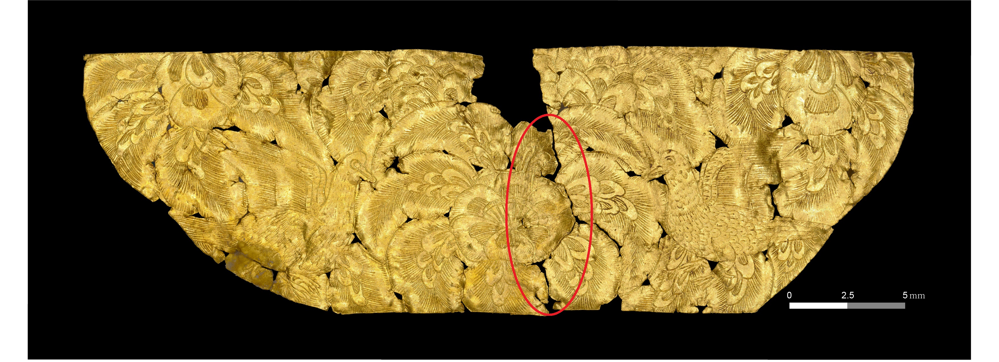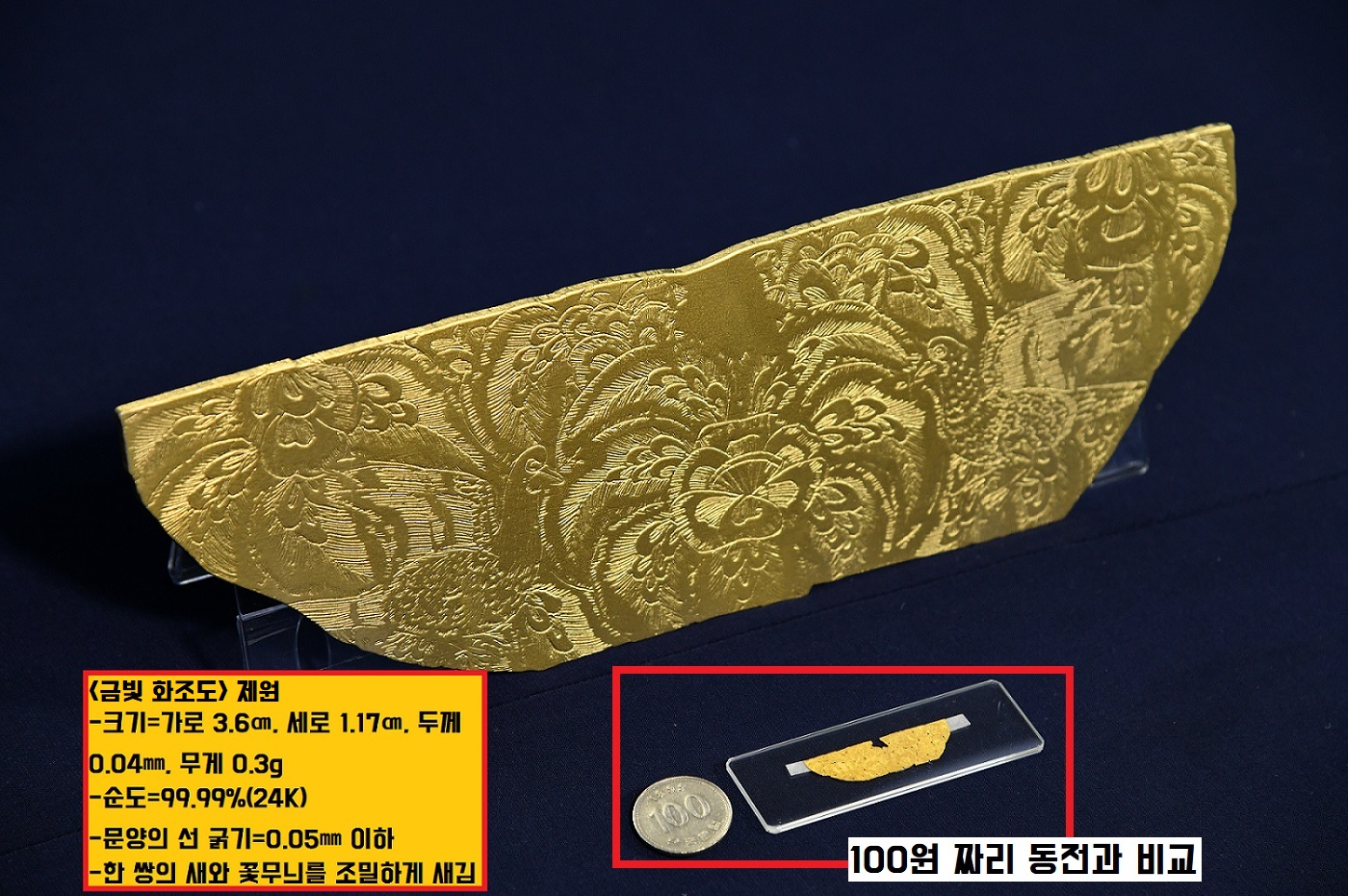 가로 3.6cm×세로 1.17cm×두께 0.04㎜에 불과한 금판에 왼쪽새(가로 0.9cm×세로 0.75cm)와 오른쪽새(가로 0.8cm×세로 0.65cm), 그리고 꽃문양(가로 1.37cm×세로 0.92cm)까지 새겼다는 거 아닙니까. 이게 가능할까요.