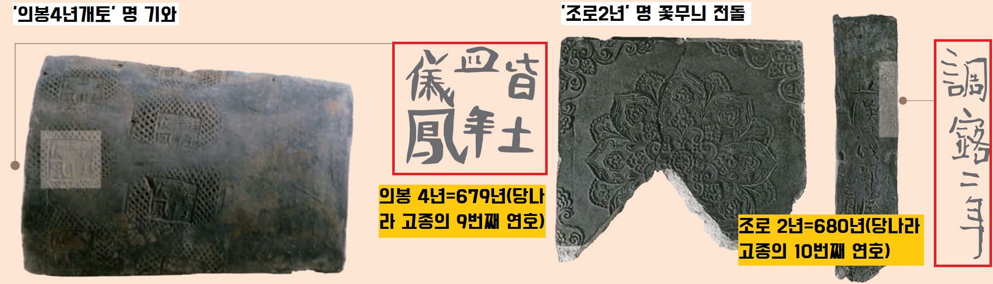 연못 안팎에서 출토된 유물은 3만3000여점에 달했답니다. 그중 안압지 주변의 건물지에서 출토된 ‘의봉4년개토(679)’명 기와와 ‘조로2년(680)’명 전돌이 매우 중요한 표지유물이었습니다. ‘의봉’(676년 11월~679년 6월)과 ‘조로’(679년 6월~680년 8월)는 당나라 고종(650~682)의 연호 중 각각 9, 10번째의 연호거든요.