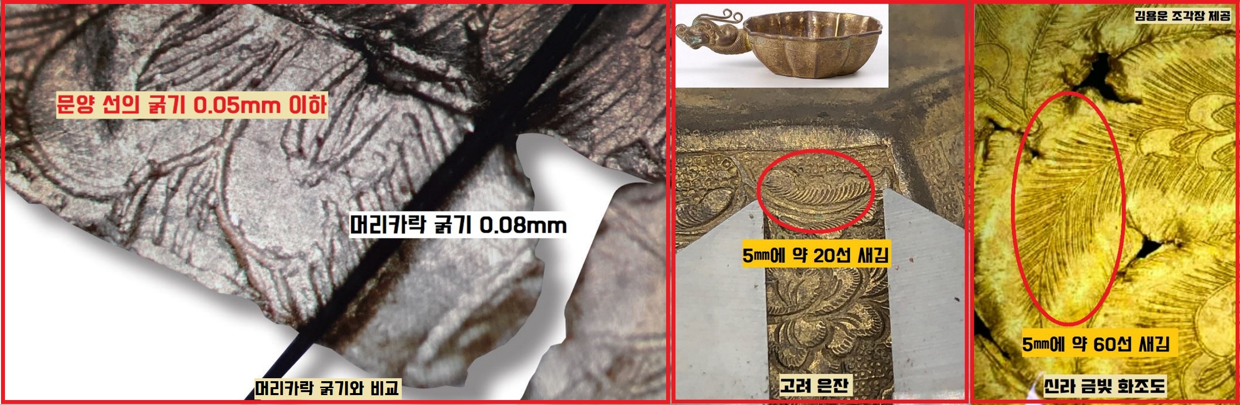 김용운 조각장은 고려시대 금도금 은잔의 문양을 보여주었는데요. 이 은잔은 5㎜에 약 20선을 조각했는데, 신라금판은 5㎜ 사이에 약 60선을 새겼다는군요. 신라 금판이 고려 은제잔보다 3분의 1정도 더 정밀했다는 얘기죠. 무엇보다 컴퓨터와 레이저를 사용해도 새기기 어려운 극초정밀 기술이라니 입이 딱 벌어질 정도입니다.