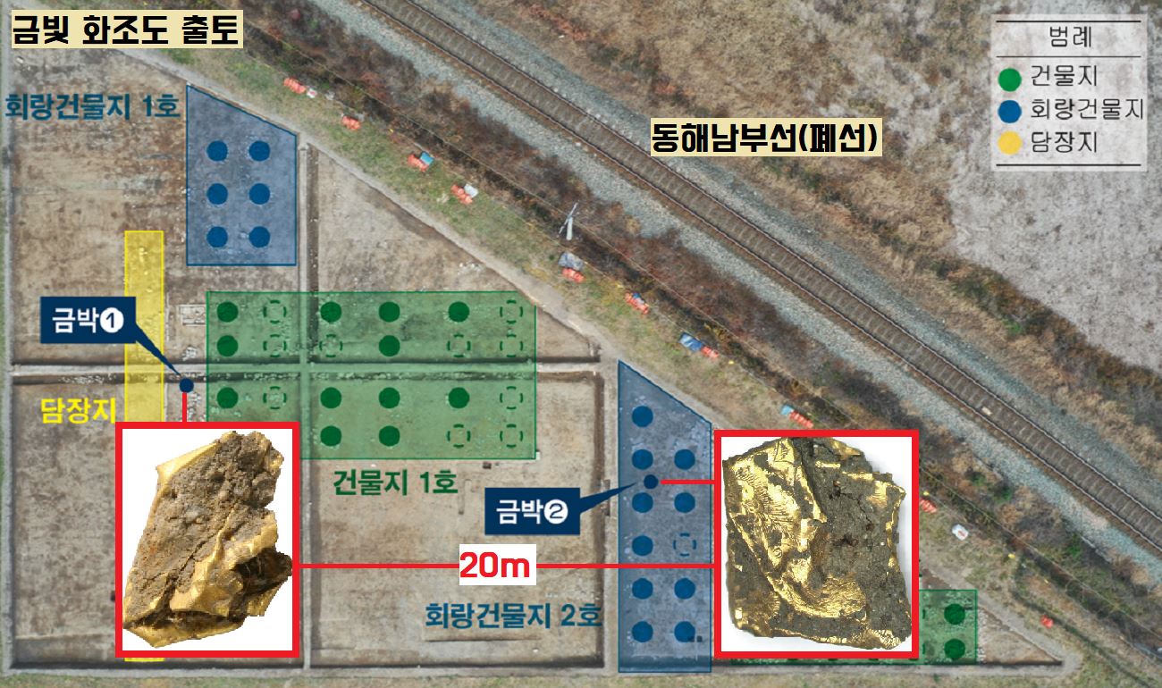 그것은 금박이었습니다. 그로부터 10여일이 지난 뒤 또다른 인부가 첫번째 발견지점에서 20m 떨어진 회랑건물터에서 반짝거리는 물체를 발견합니다.