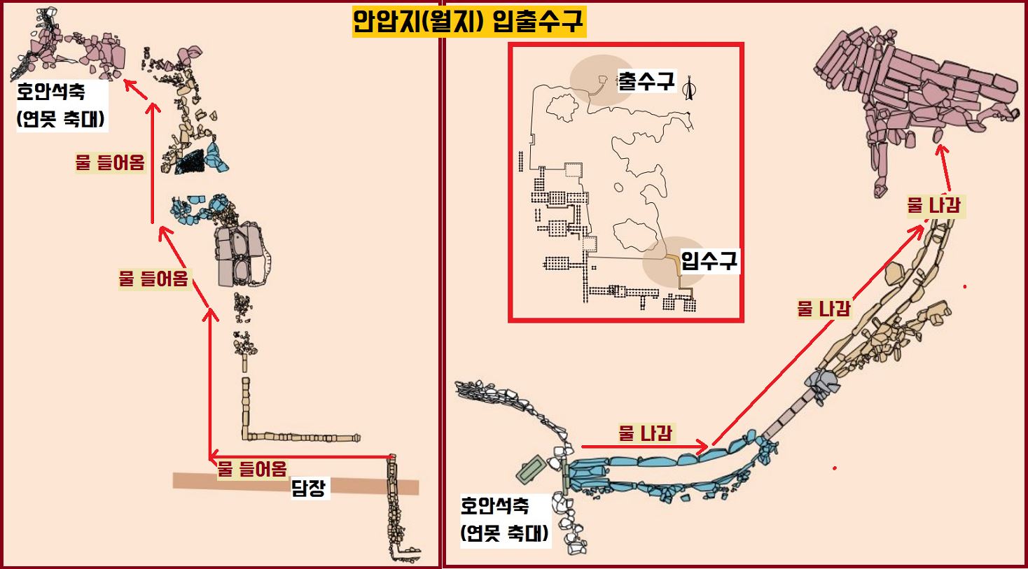 기러기 ‘안(雁)’자에 오리 ‘압(鴨)’자를 쓴 것으로 보아 기러기나 오리 떼가 노는 연못(지·池)이라는 뜻이겠죠.