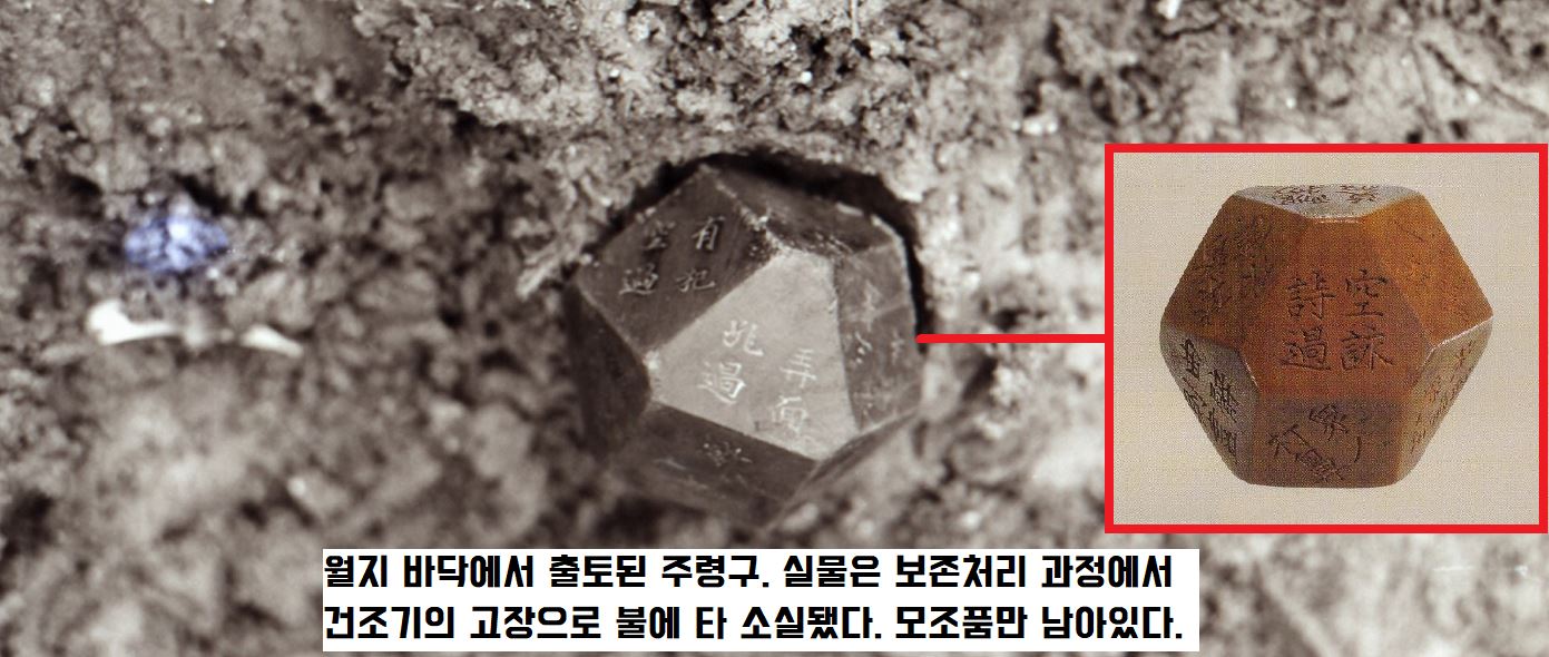 연못의 바닥 뻘층에서 확인된 주령구(酒令具)는 6개의 사각형과 8개의 육각형으로 된 ‘14면체 주사위’였는데요.