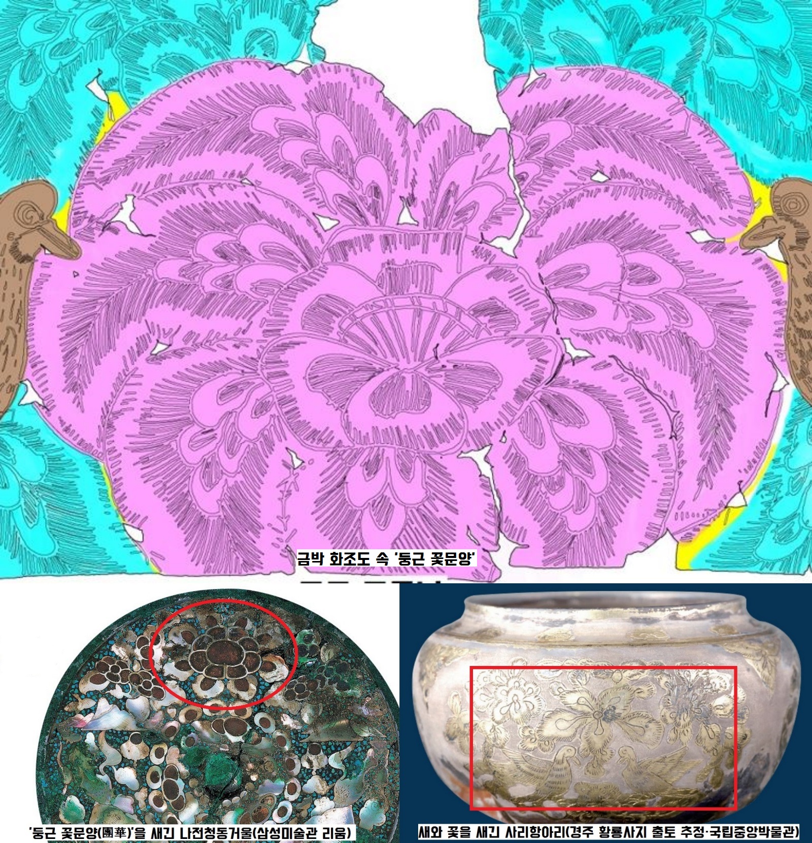 바탕에 새긴 꽃은 상상의 꽃잎 문양인 단화(團華)인데요. 이런 꽃문양도 국내 출토 사례가 제법 됩니다.